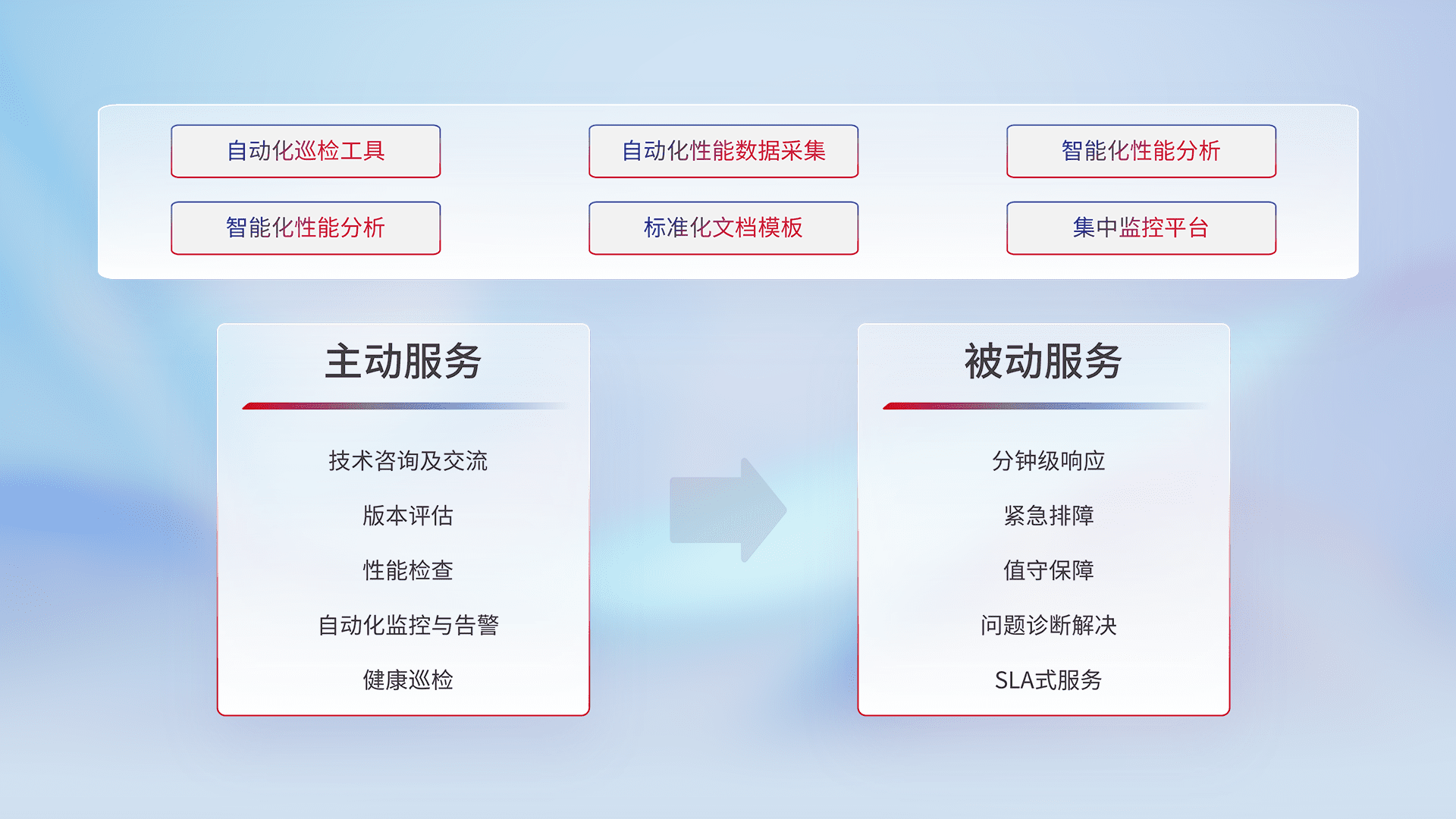智能化工具和标准化文档,,,,保障服务质量,,,,提供主动服务(包含技术咨询、、、、版本评估、、、、性能检查、、、、自动化监控与告警、、、、健康巡检)和被动服务包含(分钟级响应、、紧急排障、、、、值守保障、、、问题诊断解决、、、、SLA服务)。。。。